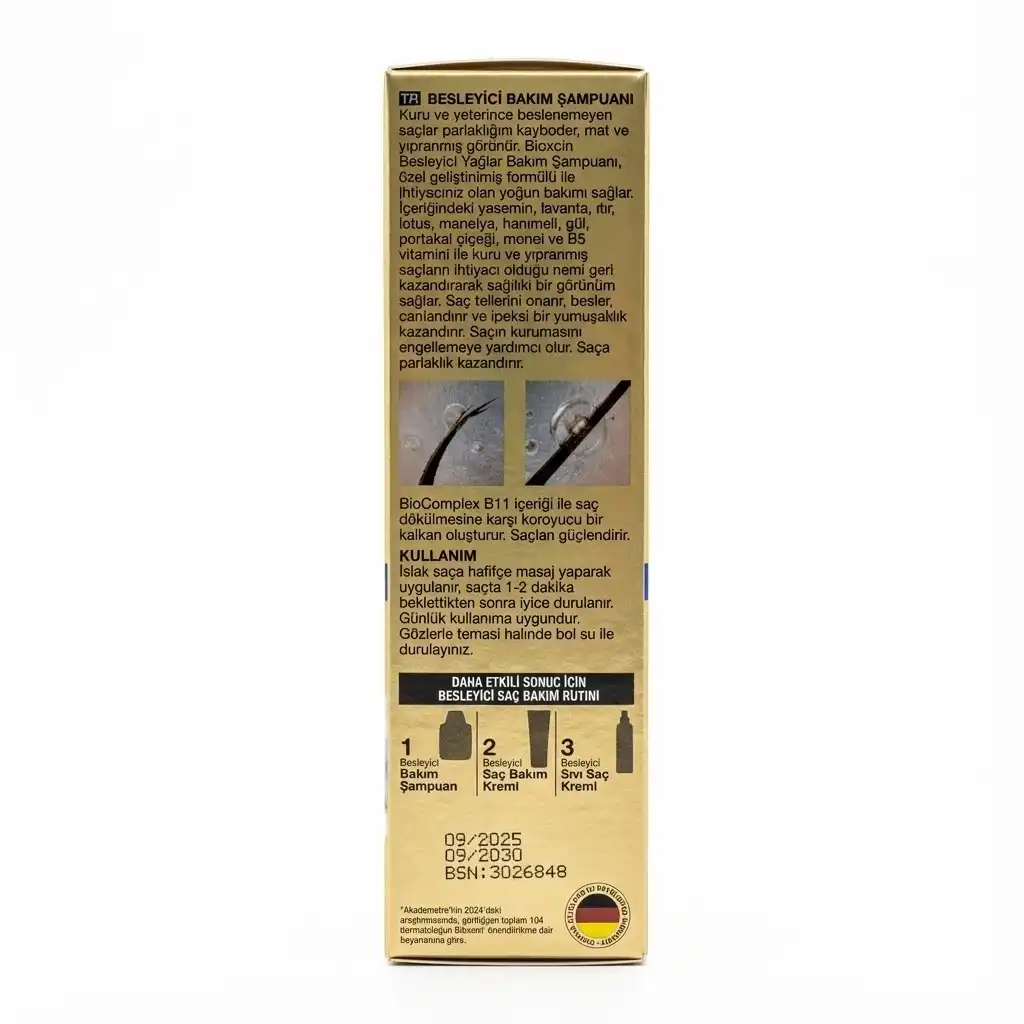 شامپو بیوکسین Bioxcin طلایی مدل Nourishing Oils بدون سولفات و ضد ریزش قوی حجم 300 میلی لیتری