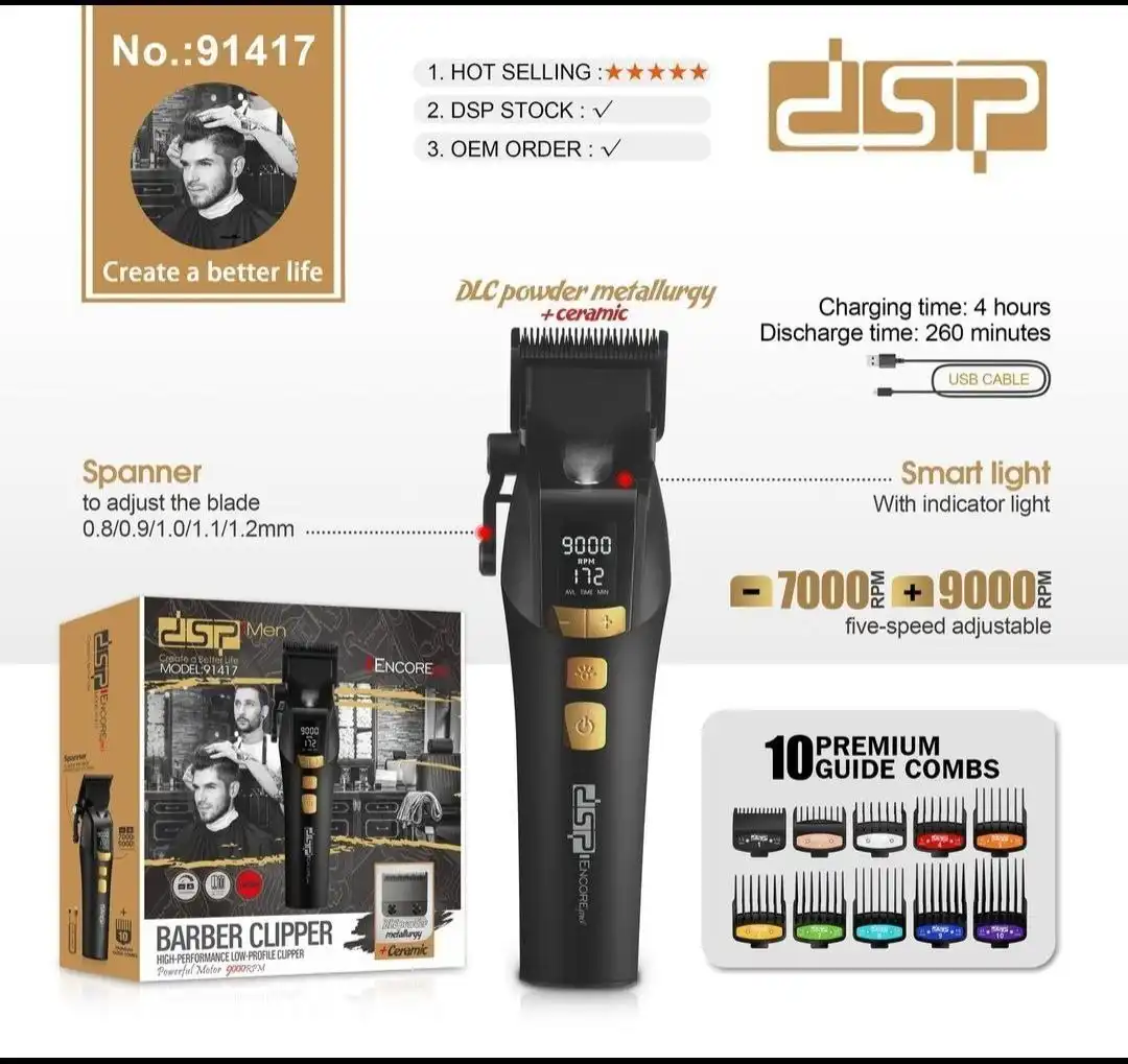ماشین اصلاح دی اس پی (DSP Professional) مدل 91417 که با نام تجاری “Encore Pro” شناخته می‌شود، یک ابزار تمام عیار برای آرایشگران سخت‌گیر است. این دستگاه با طراحی ارگونومیک مشکی مات و دکمه‌های طلایی، نه تنها ظاهر لوکسی دارد، بلکه در باطن خود تکنولوژی‌های پیشرفته‌ای را جای داده است.